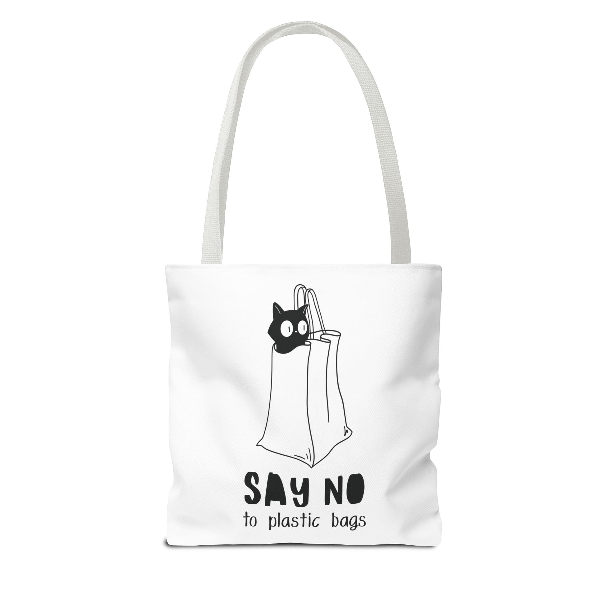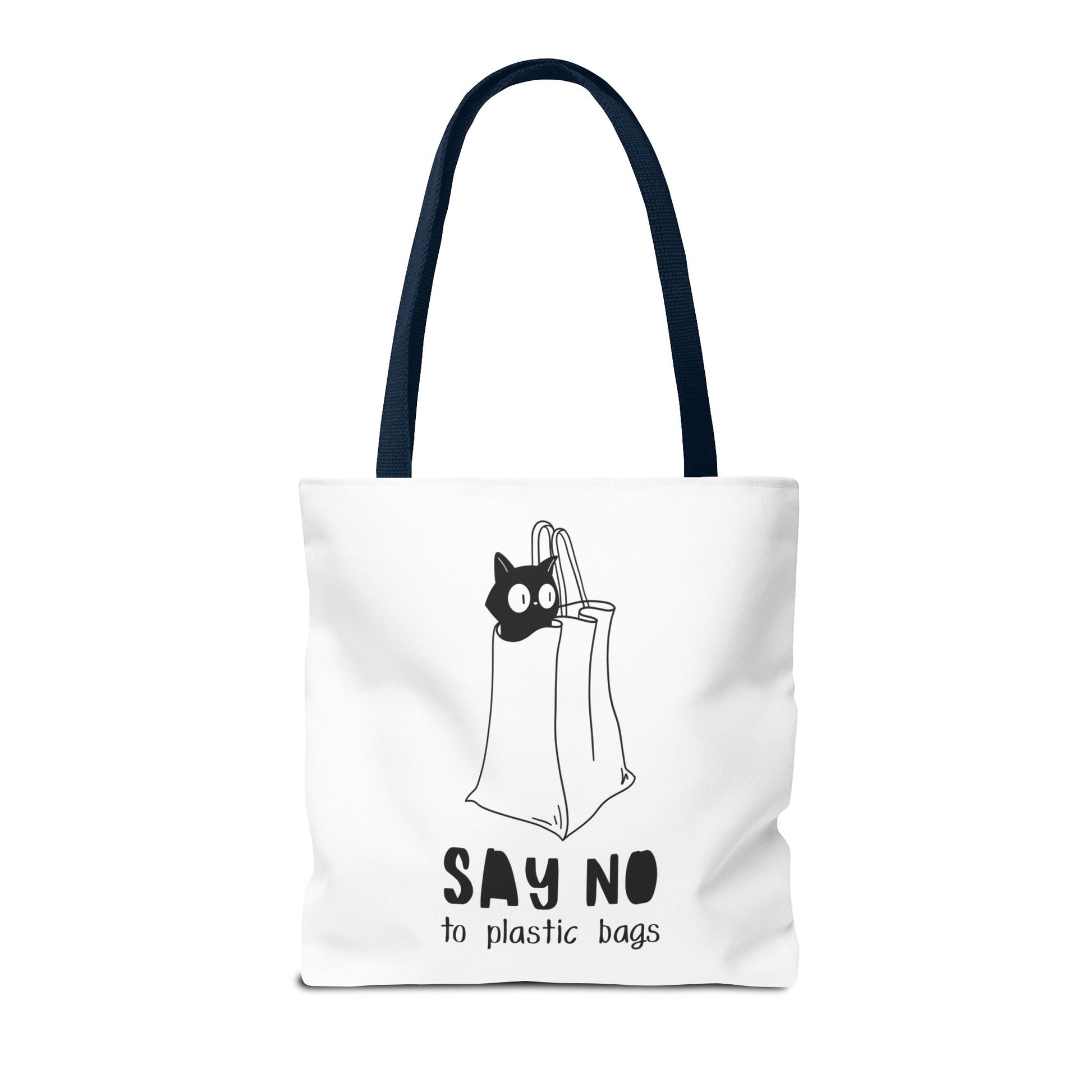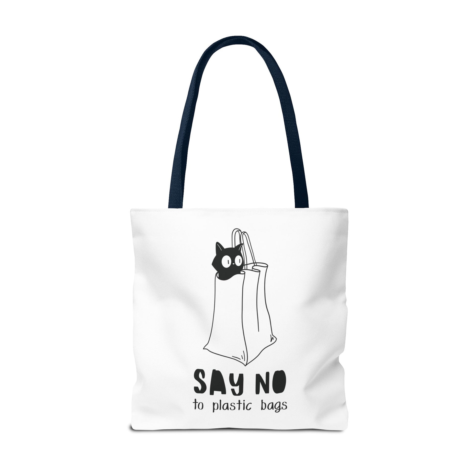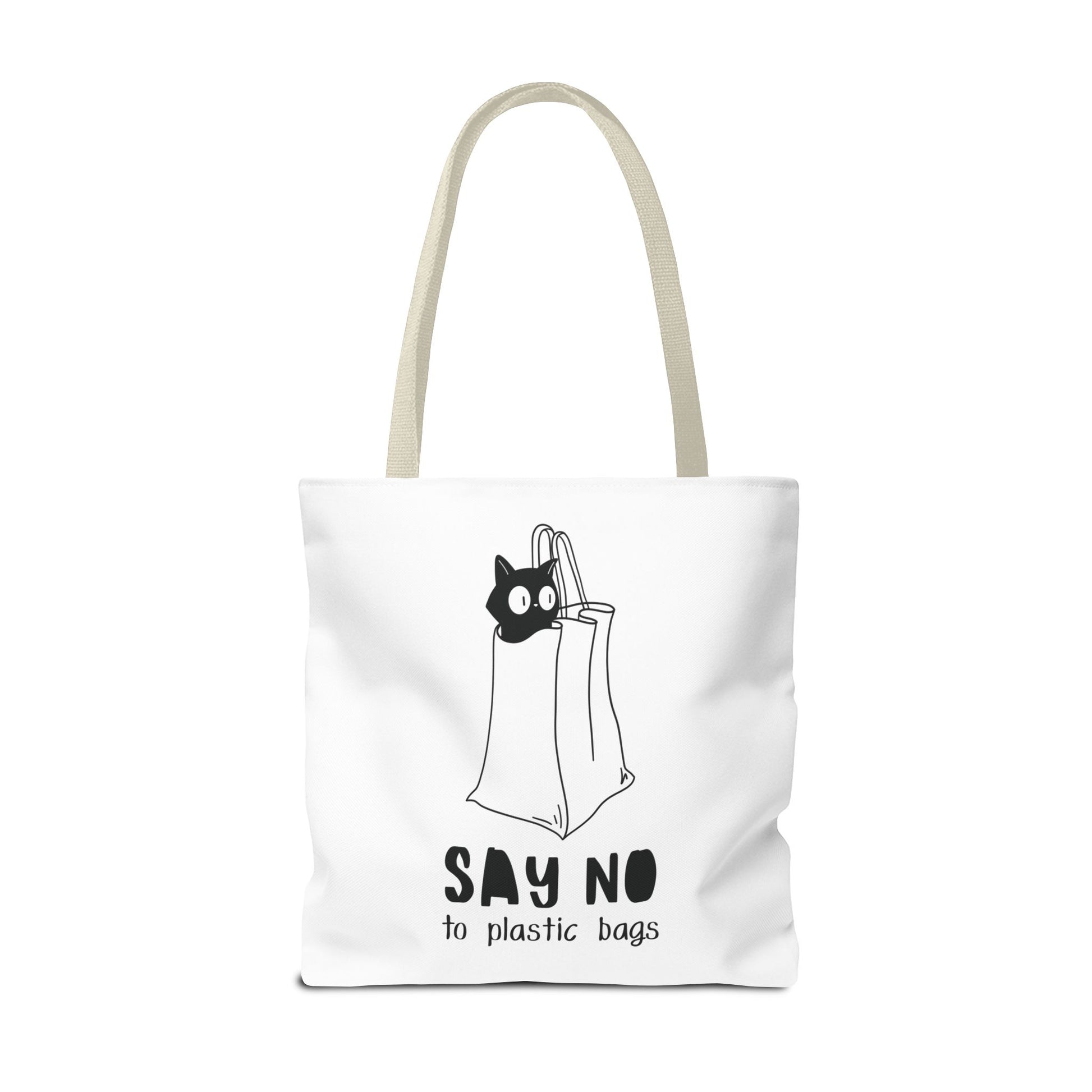 This Tote Bag by Lumen Ritual is designed for the eco-conscious individual, combining style and functionality. With a charming cat motif and a humorous message, it promotes a sustainable lifestyle by encouraging the use of reusable bags over plastic. This versatile tote offers ample space for groceries, books, or a day out, making it an essential accessory for anyone who cares about the planet. It's perfect for everyday use, shopping sprees, or as a thoughtful gift for animal lovers and eco-warriors alike. Celebrate Earth Day, or simply express your love for cats with this unique bag. Ideal for birthdays, holidays, or just because! Product features - 100% Polyester body for durability and quick drying - Reinforced stitching on handles for extra strength - Spacious boxed corners for added room - Available in 5 handle color options - Comes with a non-woven laminate inside and cotton handles. Care instructions - Remove all items from the bag before cleaning. Suggested to pretreat visible stains with stain remover. Mix warm water with laundry detergent and clean the bag with terry washcloth or a soft bristle brush. Let the bag air dry.