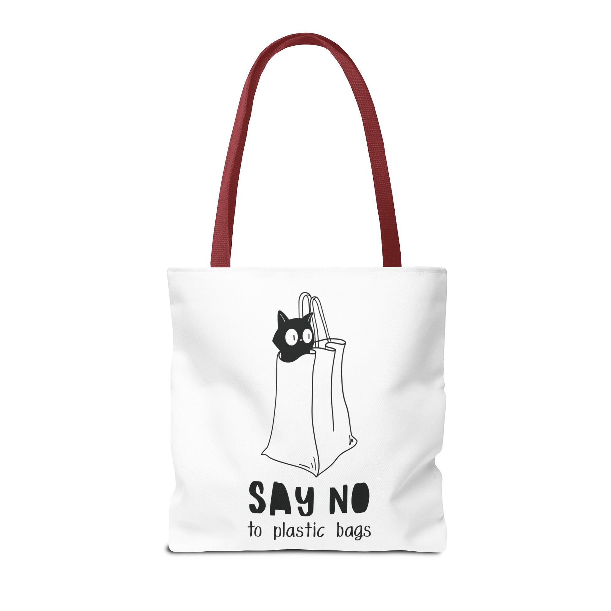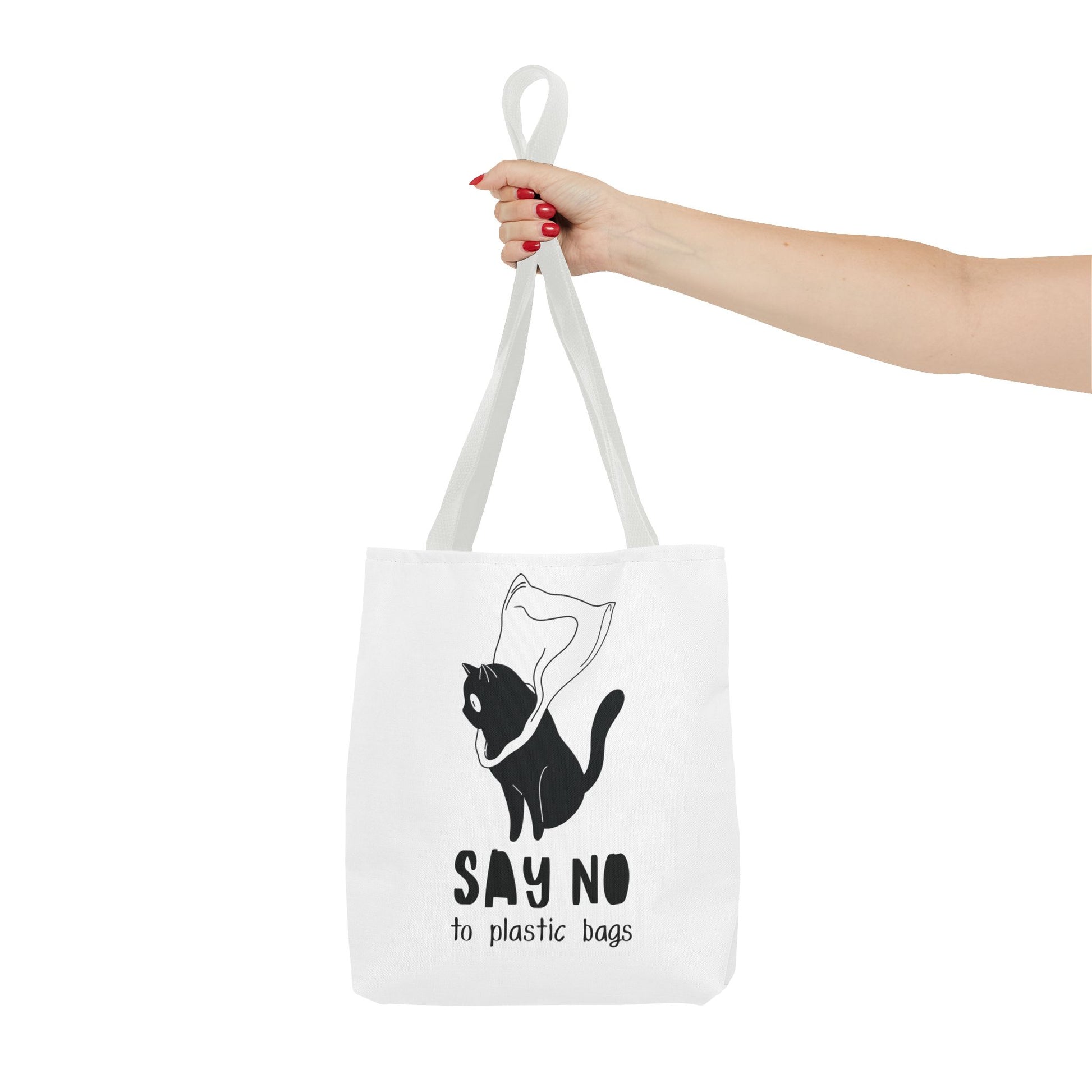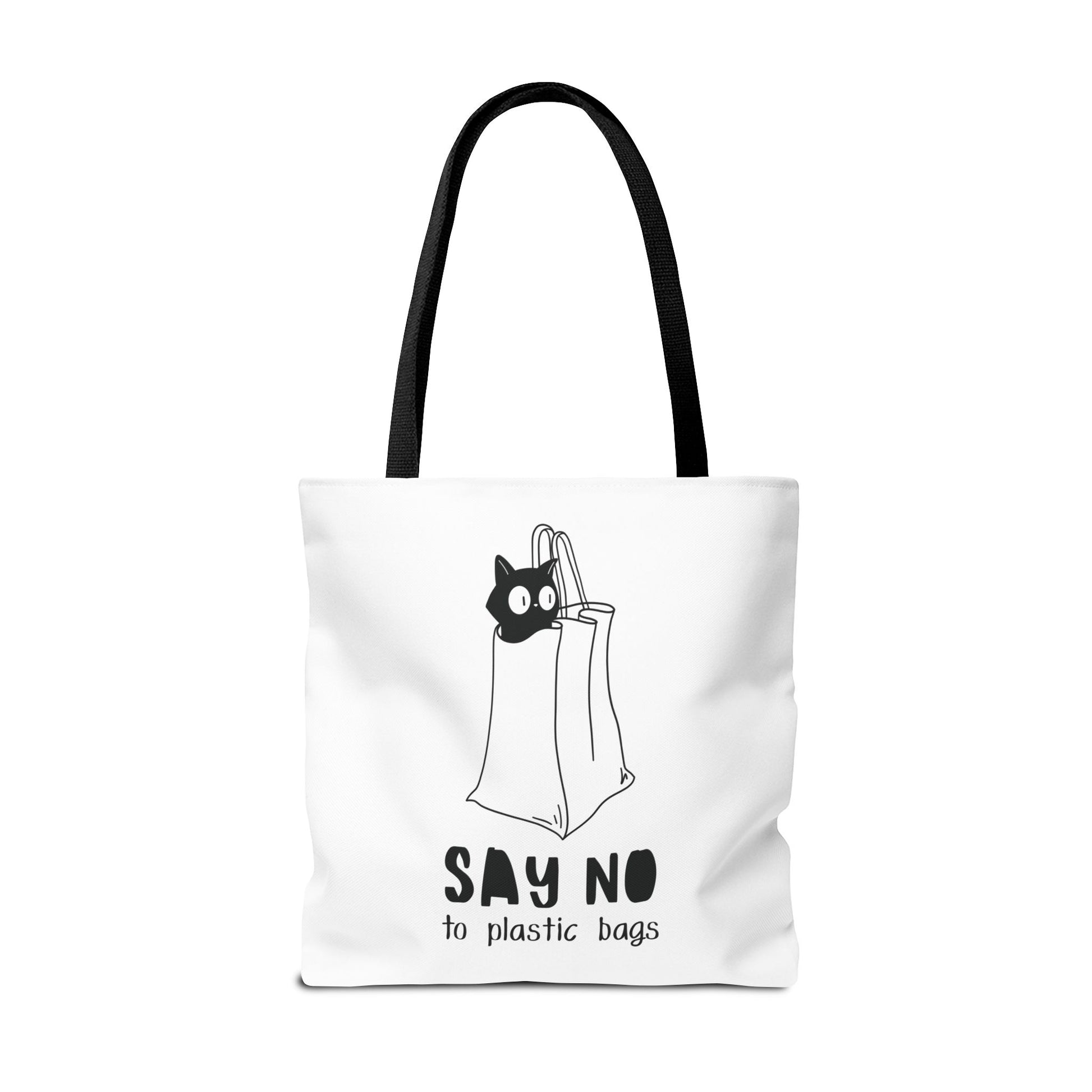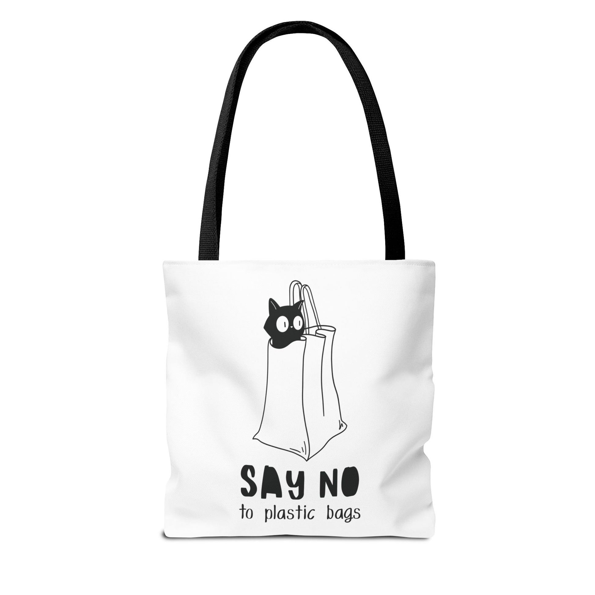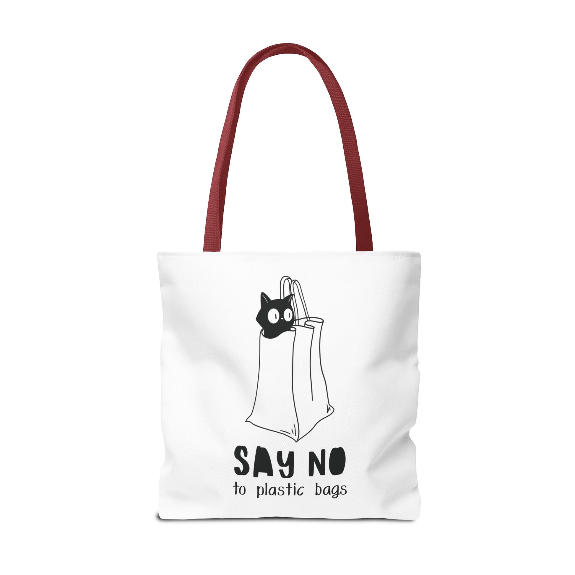 This Tote Bag by Lumen Ritual is designed for the eco-conscious individual, combining style and functionality. With a charming cat motif and a humorous message, it promotes a sustainable lifestyle by encouraging the use of reusable bags over plastic. This versatile tote offers ample space for groceries, books, or a day out, making it an essential accessory for anyone who cares about the planet. It's perfect for everyday use, shopping sprees, or as a thoughtful gift for animal lovers and eco-warriors alike. Celebrate Earth Day, or simply express your love for cats with this unique bag. Ideal for birthdays, holidays, or just because! Product features - 100% Polyester body for durability and quick drying - Reinforced stitching on handles for extra strength - Spacious boxed corners for added room - Available in 5 handle color options - Comes with a non-woven laminate inside and cotton handles. Care instructions - Remove all items from the bag before cleaning. Suggested to pretreat visible stains with stain remover. Mix warm water with laundry detergent and clean the bag with terry washcloth or a soft bristle brush. Let the bag air dry.