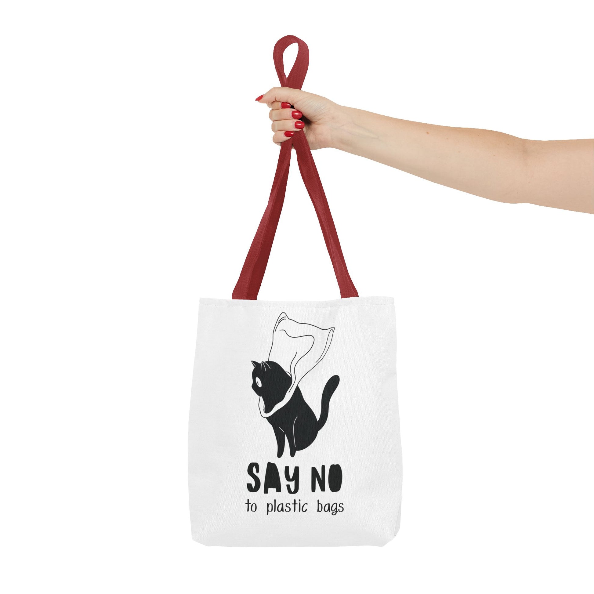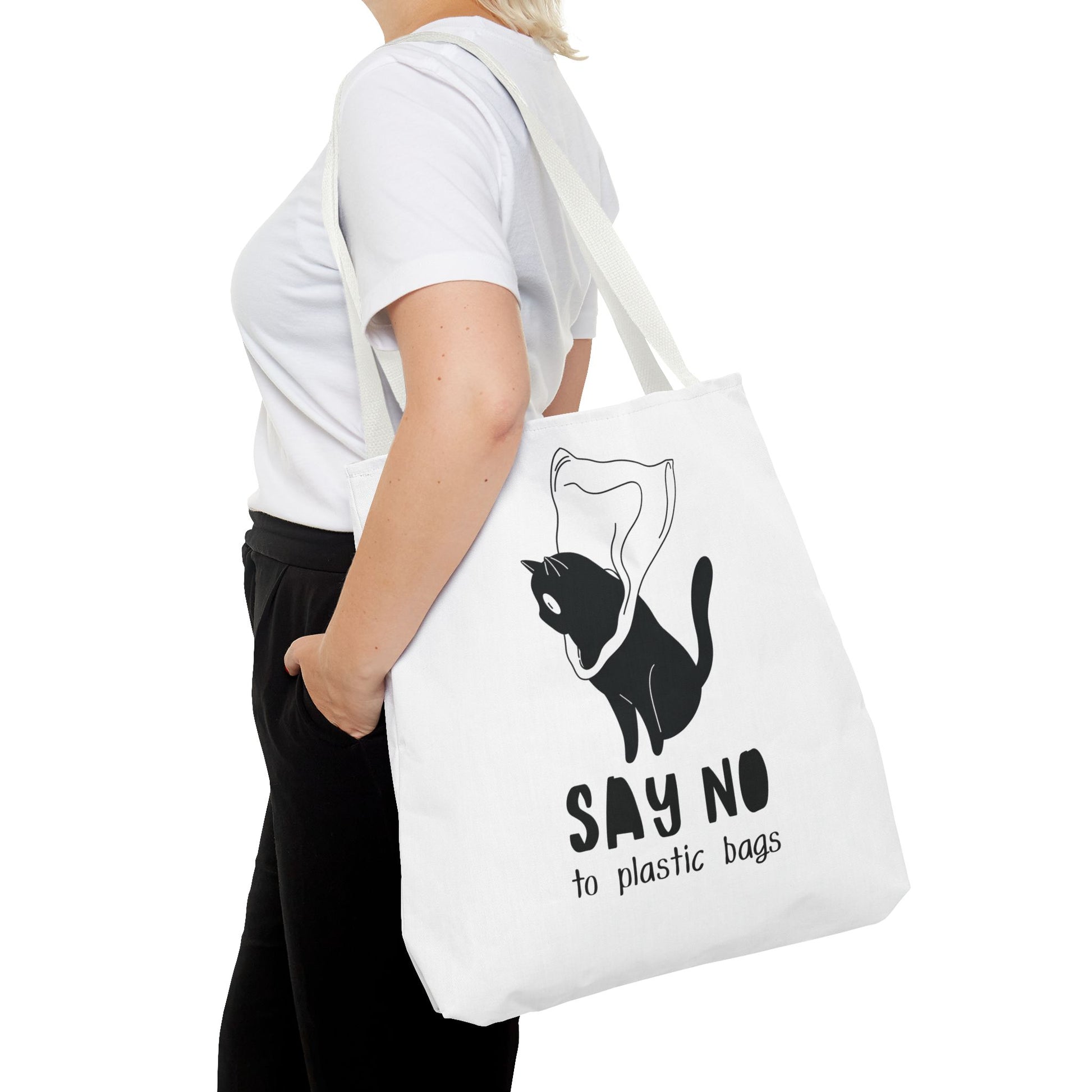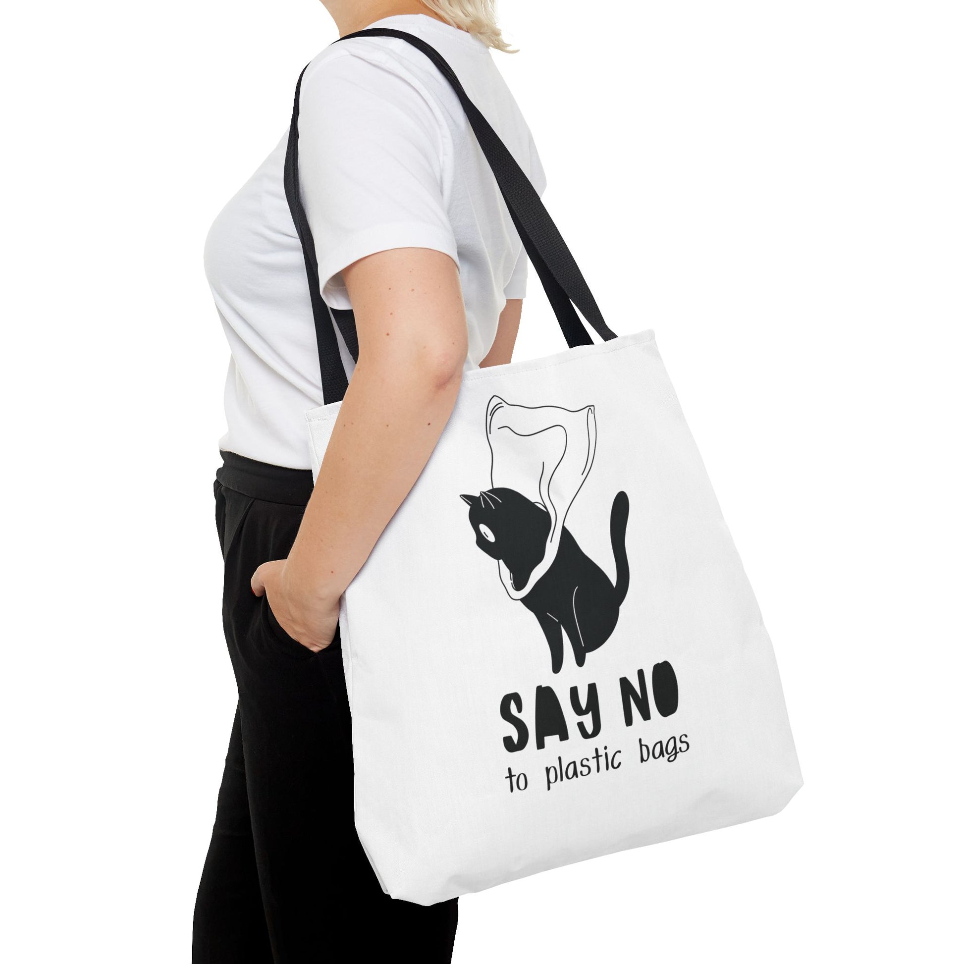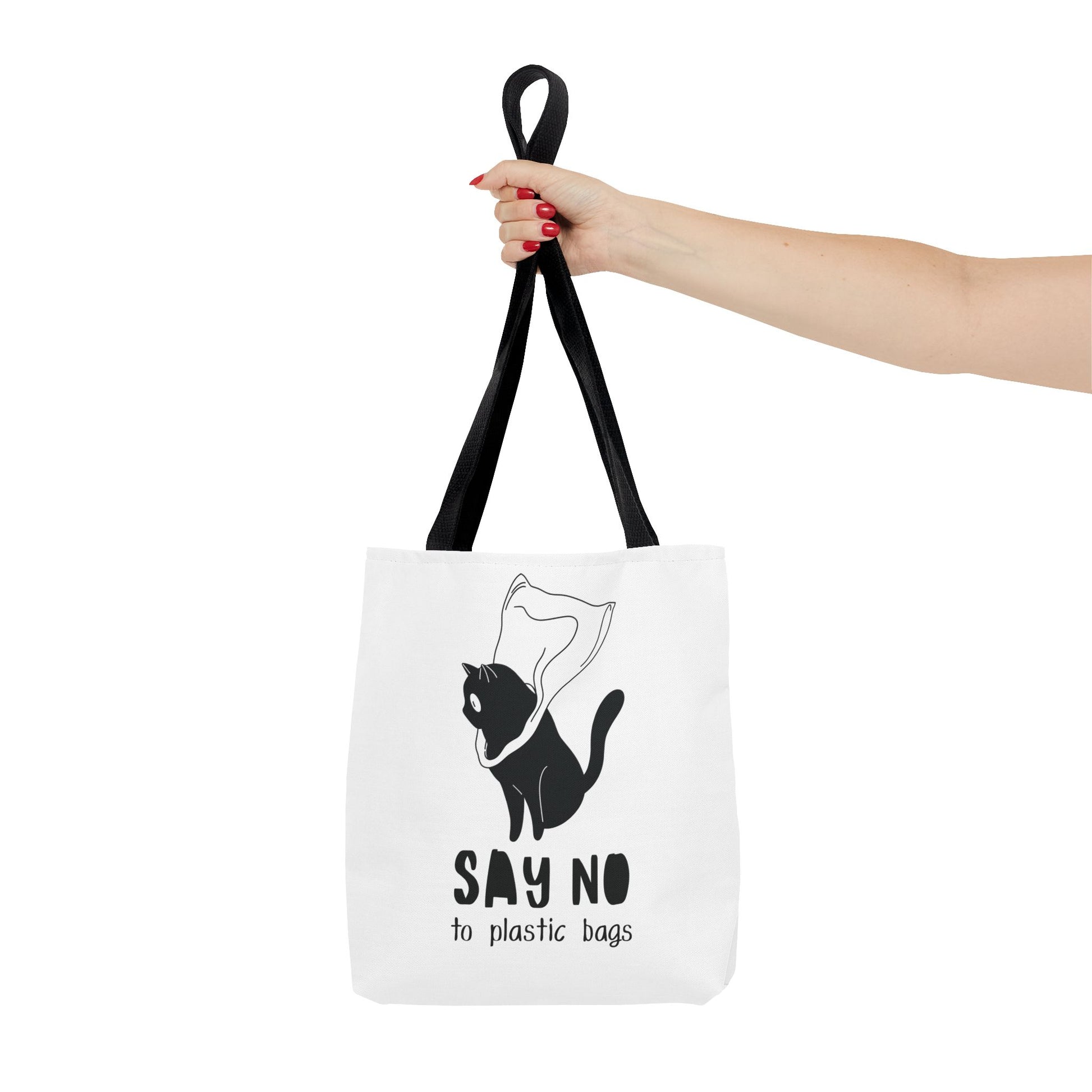 This Tote Bag by Lumen Ritual is designed for the eco-conscious individual, combining style and functionality. With a charming cat motif and a humorous message, it promotes a sustainable lifestyle by encouraging the use of reusable bags over plastic. This versatile tote offers ample space for groceries, books, or a day out, making it an essential accessory for anyone who cares about the planet. It's perfect for everyday use, shopping sprees, or as a thoughtful gift for animal lovers and eco-warriors alike. Celebrate Earth Day, or simply express your love for cats with this unique bag. Ideal for birthdays, holidays, or just because! Product features - 100% Polyester body for durability and quick drying - Reinforced stitching on handles for extra strength - Spacious boxed corners for added room - Available in 5 handle color options - Comes with a non-woven laminate inside and cotton handles. Care instructions - Remove all items from the bag before cleaning. Suggested to pretreat visible stains with stain remover. Mix warm water with laundry detergent and clean the bag with terry washcloth or a soft bristle brush. Let the bag air dry.