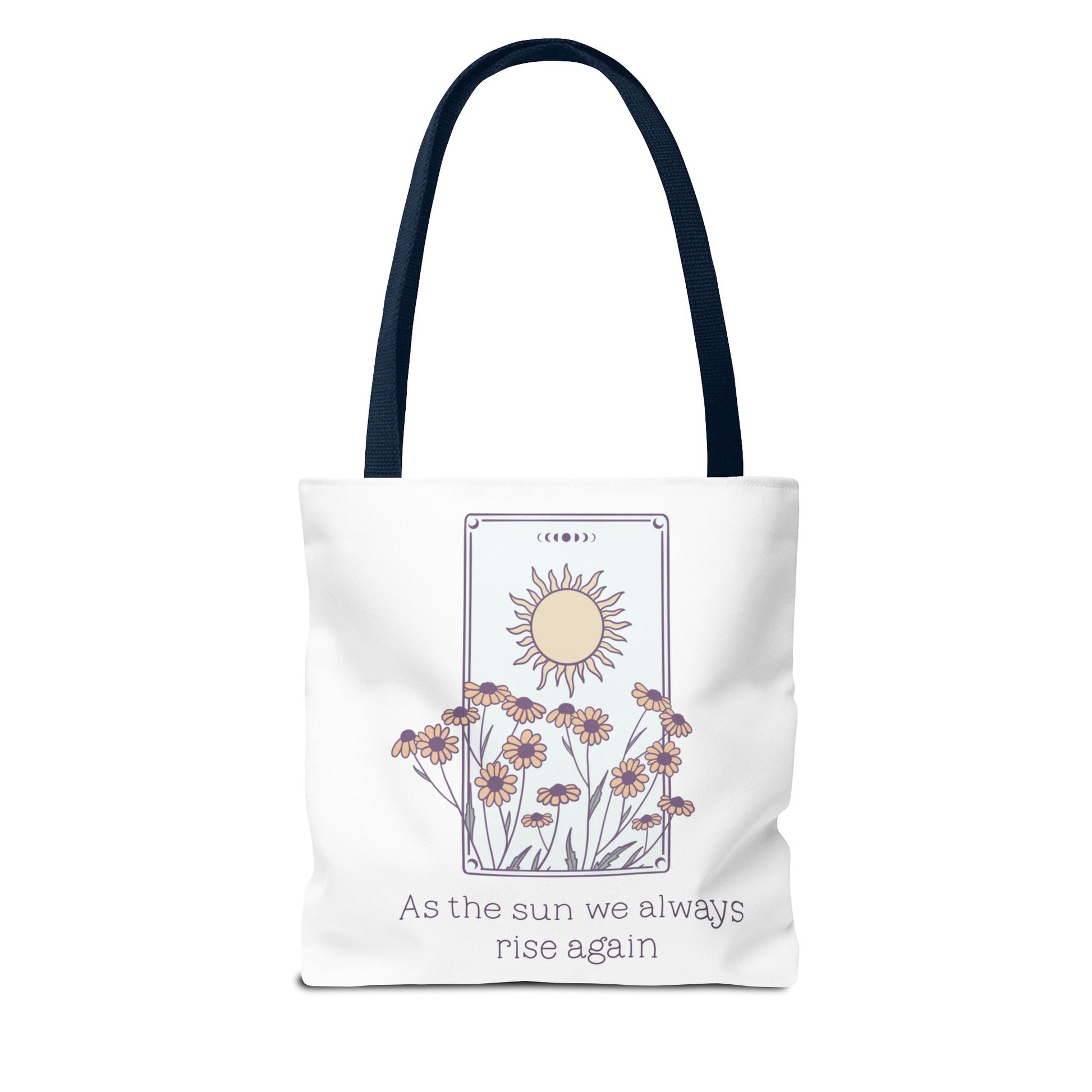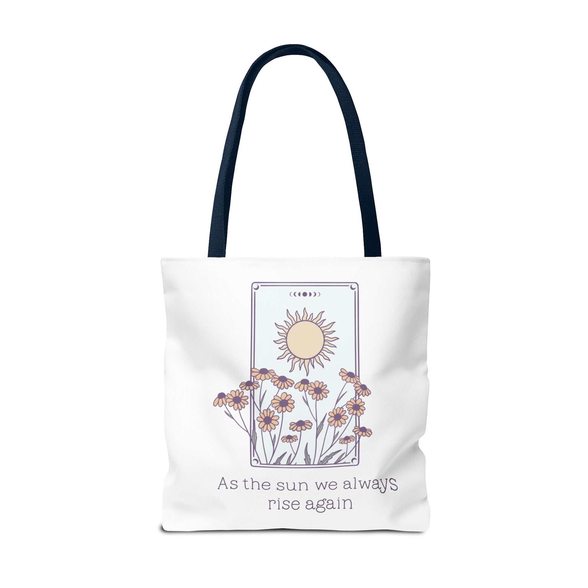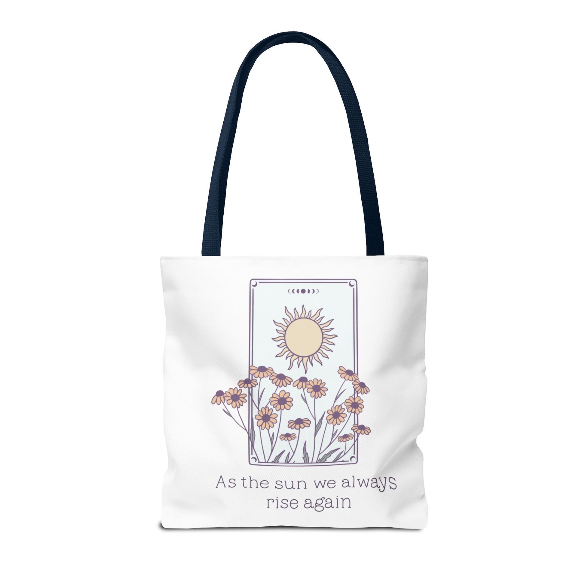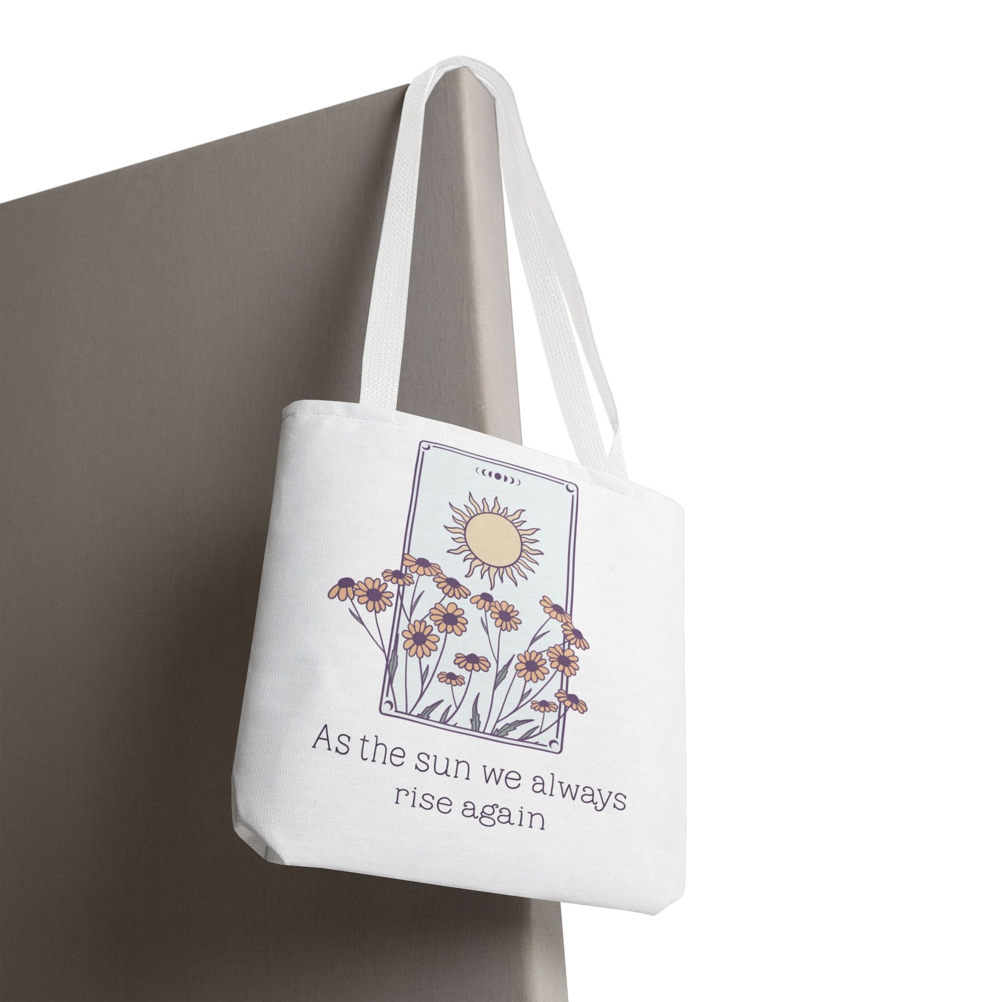 Elevate your everyday style with this exquisite tote bag. Crafted for durability and elegance, this tote effortlessly combines functionality with a stunning design featuring a beautiful illustration of sunflowers and a sun motif. The uplifting message "As the sun we always rise again" evokes a sense of positivity and resilience, making it a perfect companion for daily errands or weekend adventures. This tote bag is tailored for eco-conscious shoppers, art lovers, and anyone in need of a stylish yet practical accessory. Ideal for birthdays, graduations, Earth Day, or simply as a thoughtful gift for yourself or a loved one, it adds a cheerful touch to any occasion. Let this tote bag be a part of your journey, radiating positivity and style wherever you go.