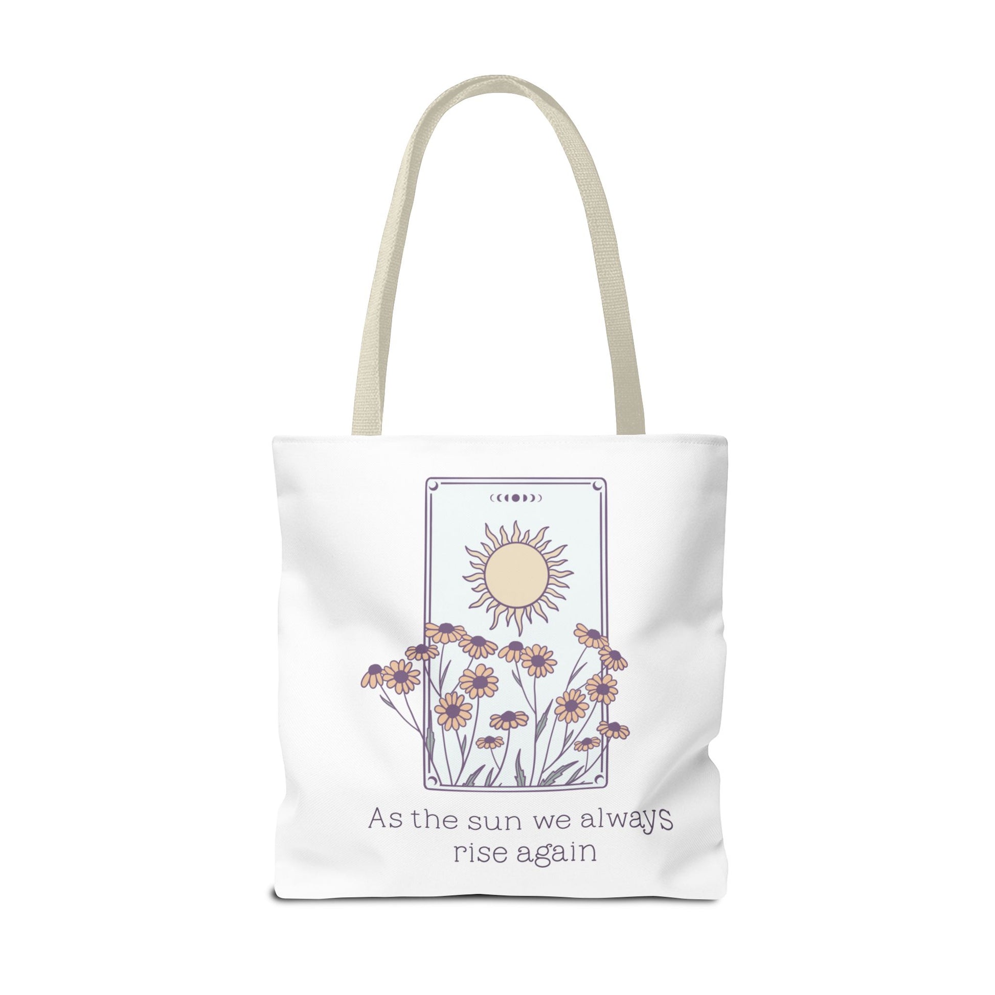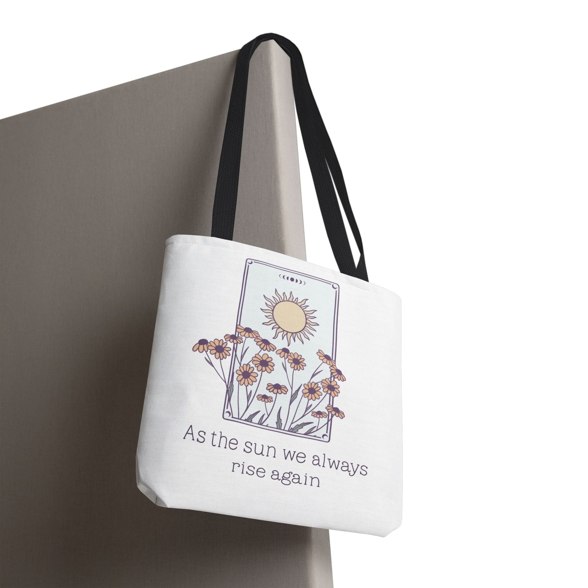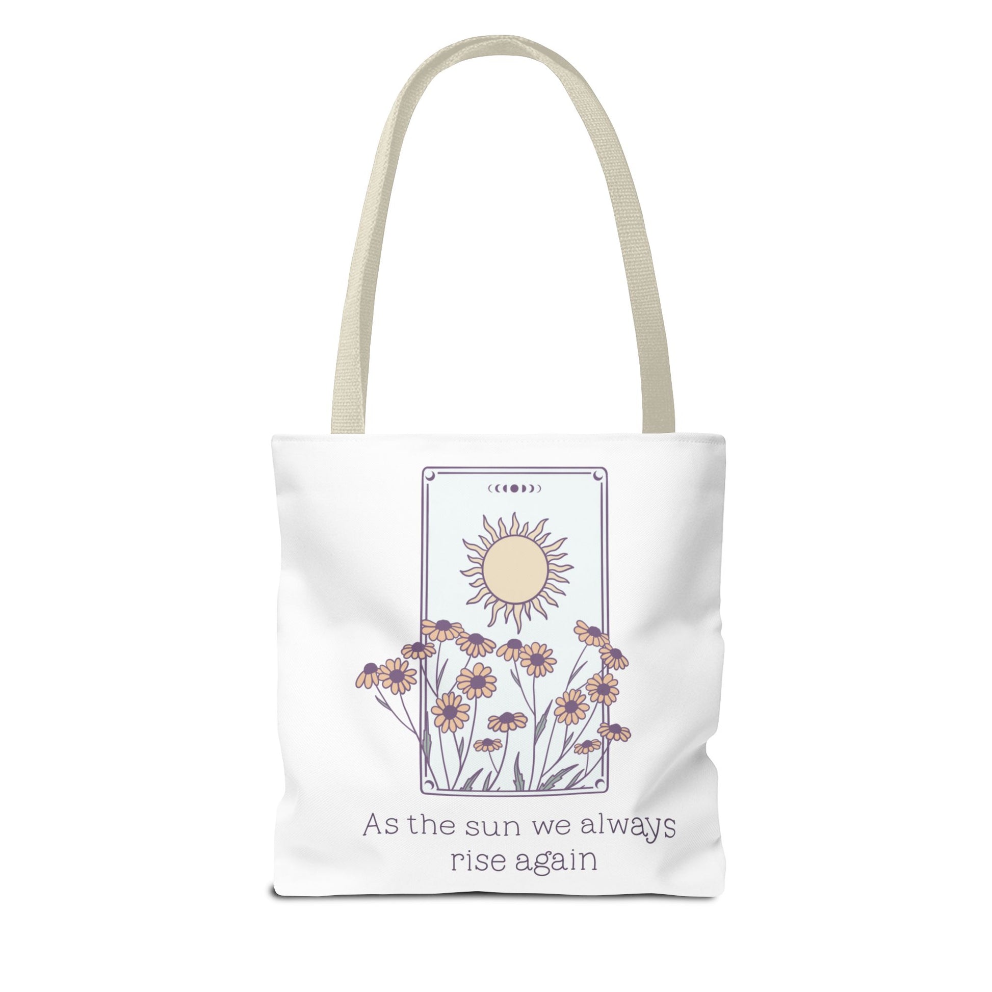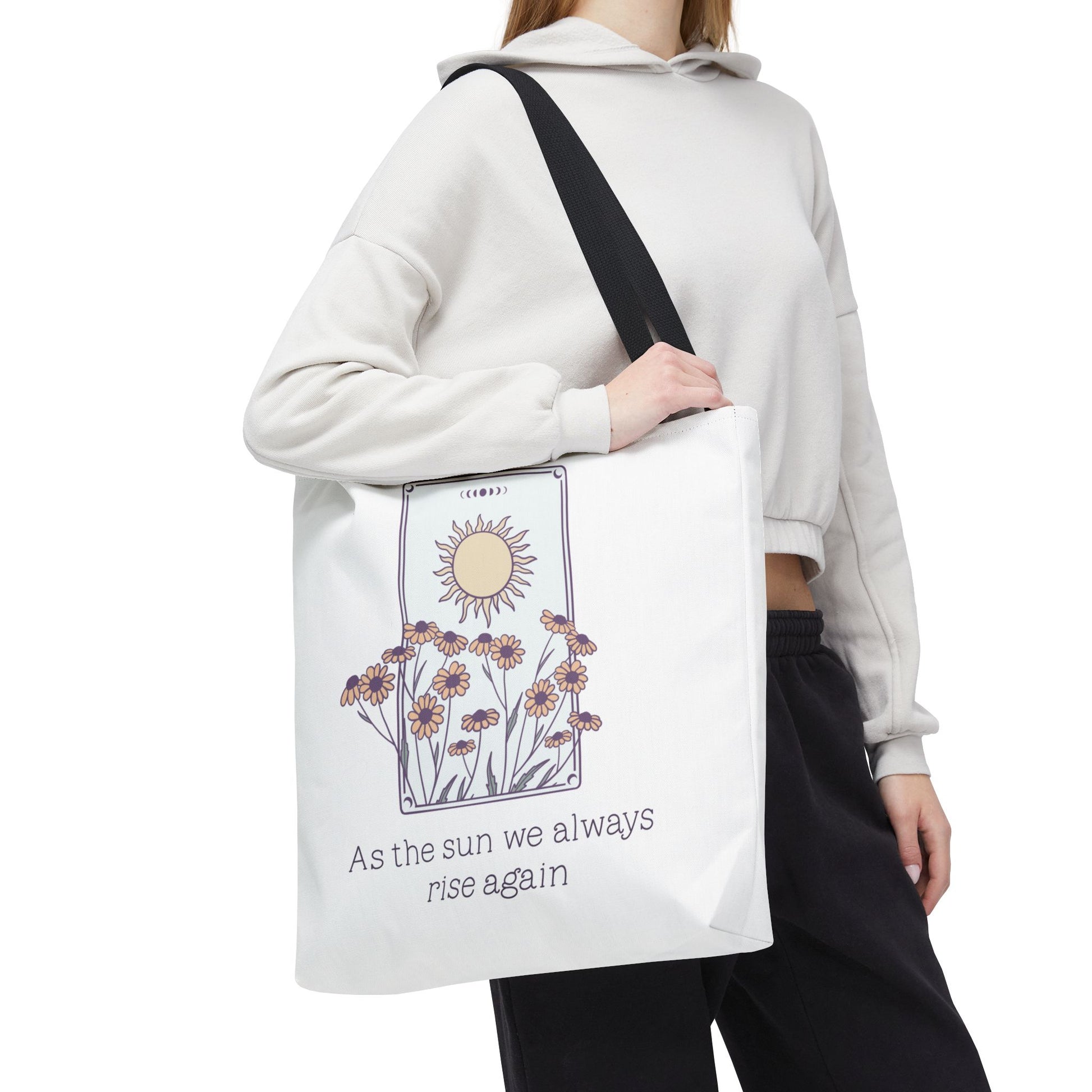 Elevate your everyday style with this exquisite tote bag. Crafted for durability and elegance, this tote effortlessly combines functionality with a stunning design featuring a beautiful illustration of sunflowers and a sun motif. The uplifting message "As the sun we always rise again" evokes a sense of positivity and resilience, making it a perfect companion for daily errands or weekend adventures. This tote bag is tailored for eco-conscious shoppers, art lovers, and anyone in need of a stylish yet practical accessory. Ideal for birthdays, graduations, Earth Day, or simply as a thoughtful gift for yourself or a loved one, it adds a cheerful touch to any occasion. Let this tote bag be a part of your journey, radiating positivity and style wherever you go.