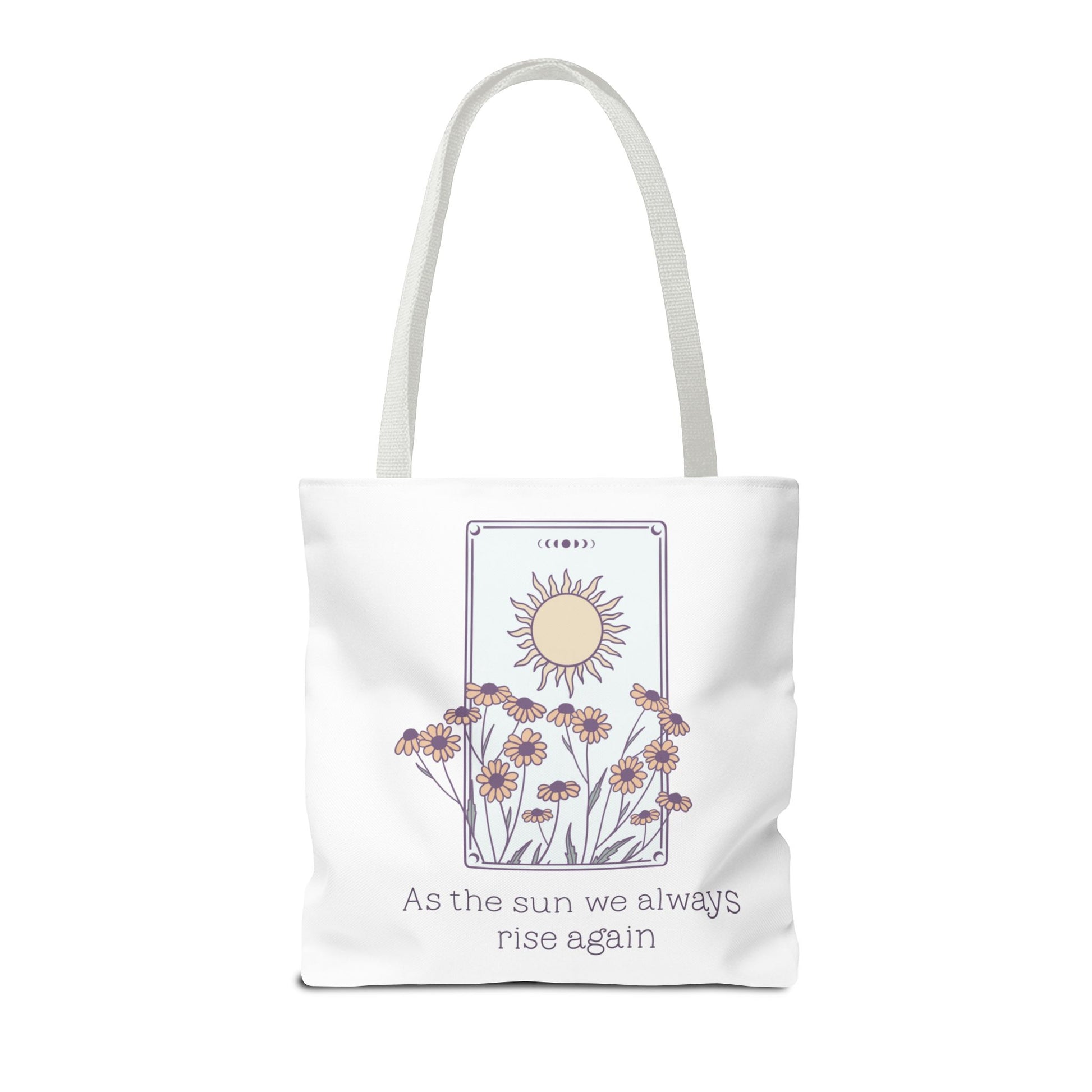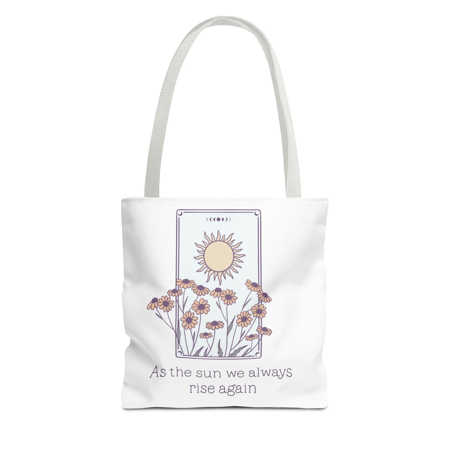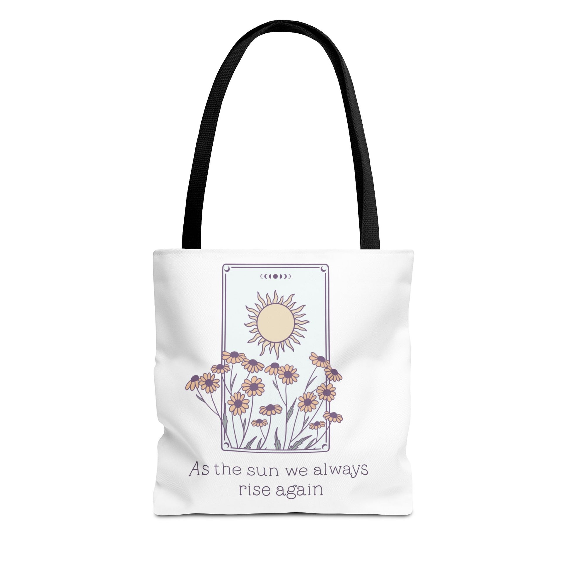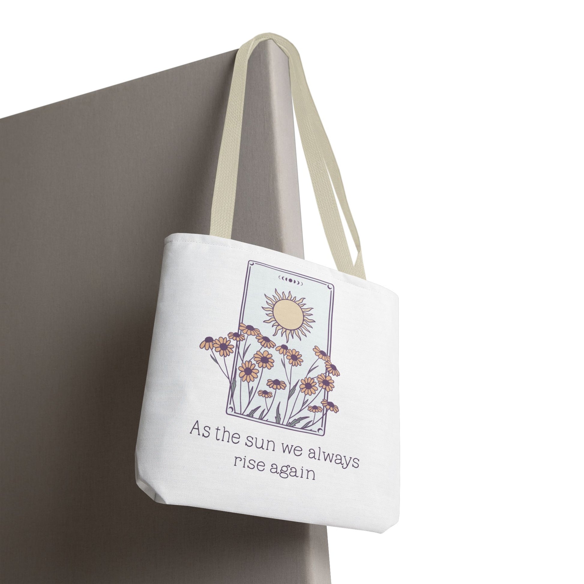 Elevate your everyday style with this exquisite tote bag. Crafted for durability and elegance, this tote effortlessly combines functionality with a stunning design featuring a beautiful illustration of sunflowers and a sun motif. The uplifting message "As the sun we always rise again" evokes a sense of positivity and resilience, making it a perfect companion for daily errands or weekend adventures. This tote bag is tailored for eco-conscious shoppers, art lovers, and anyone in need of a stylish yet practical accessory. Ideal for birthdays, graduations, Earth Day, or simply as a thoughtful gift for yourself or a loved one, it adds a cheerful touch to any occasion. Let this tote bag be a part of your journey, radiating positivity and style wherever you go.