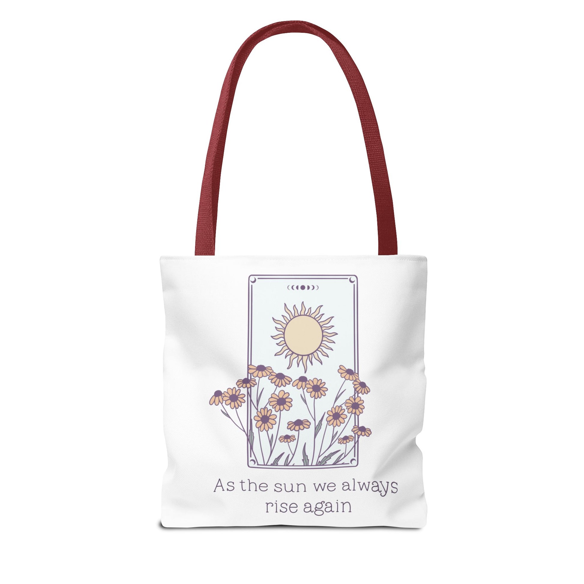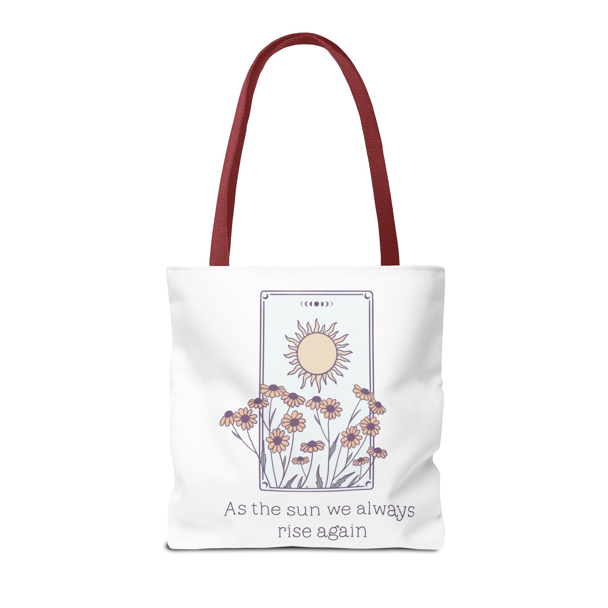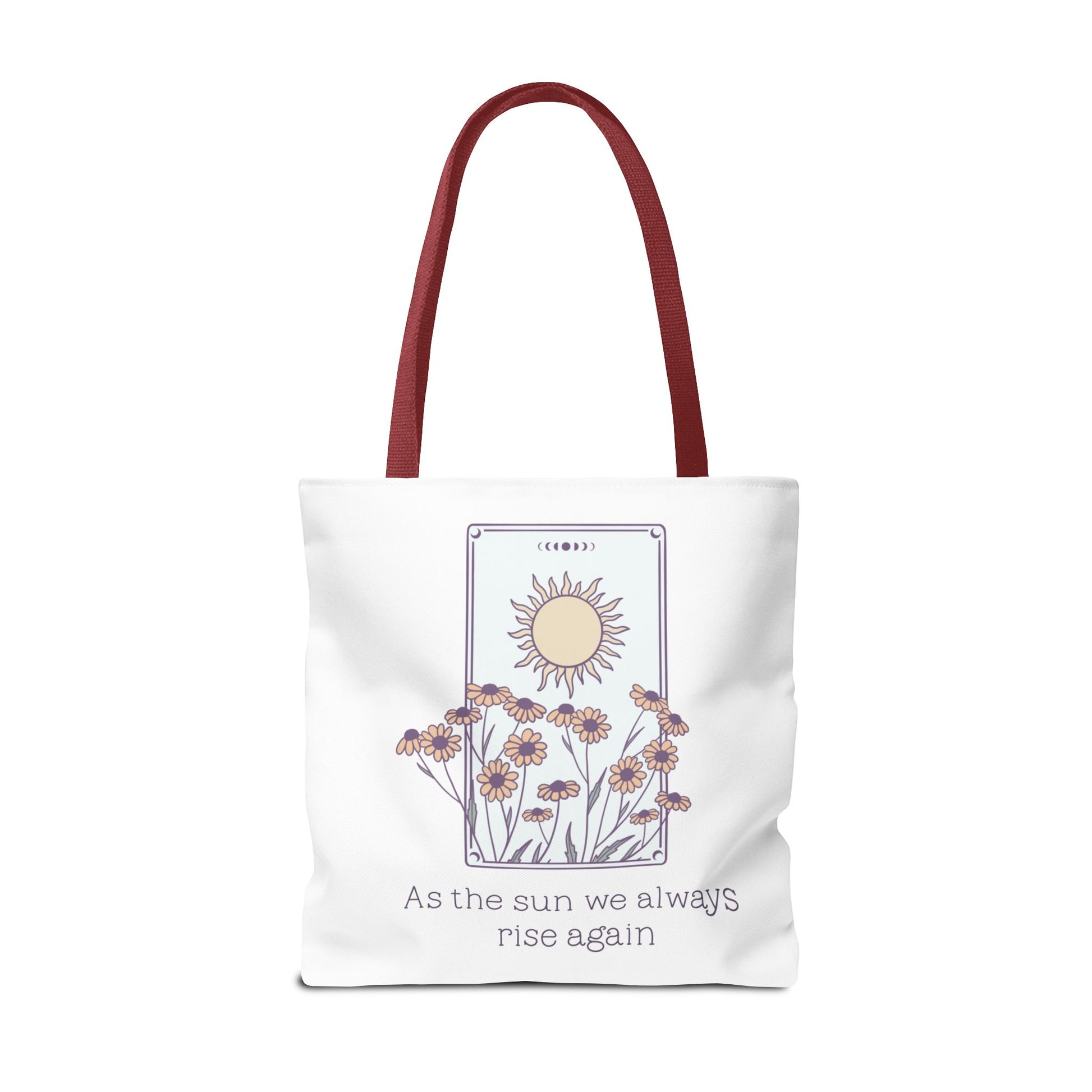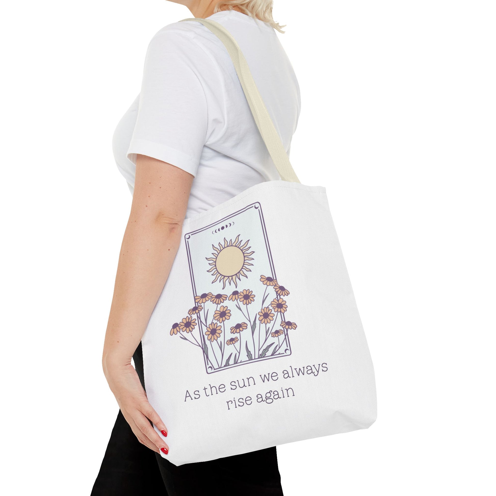Elevate your everyday style with this exquisite tote bag. Crafted for durability and elegance, this tote effortlessly combines functionality with a stunning design featuring a beautiful illustration of sunflowers and a sun motif. The uplifting message "As the sun we always rise again" evokes a sense of positivity and resilience, making it a perfect companion for daily errands or weekend adventures. This tote bag is tailored for eco-conscious shoppers, art lovers, and anyone in need of a stylish yet practical accessory. Ideal for birthdays, graduations, Earth Day, or simply as a thoughtful gift for yourself or a loved one, it adds a cheerful touch to any occasion. Let this tote bag be a part of your journey, radiating positivity and style wherever you go.