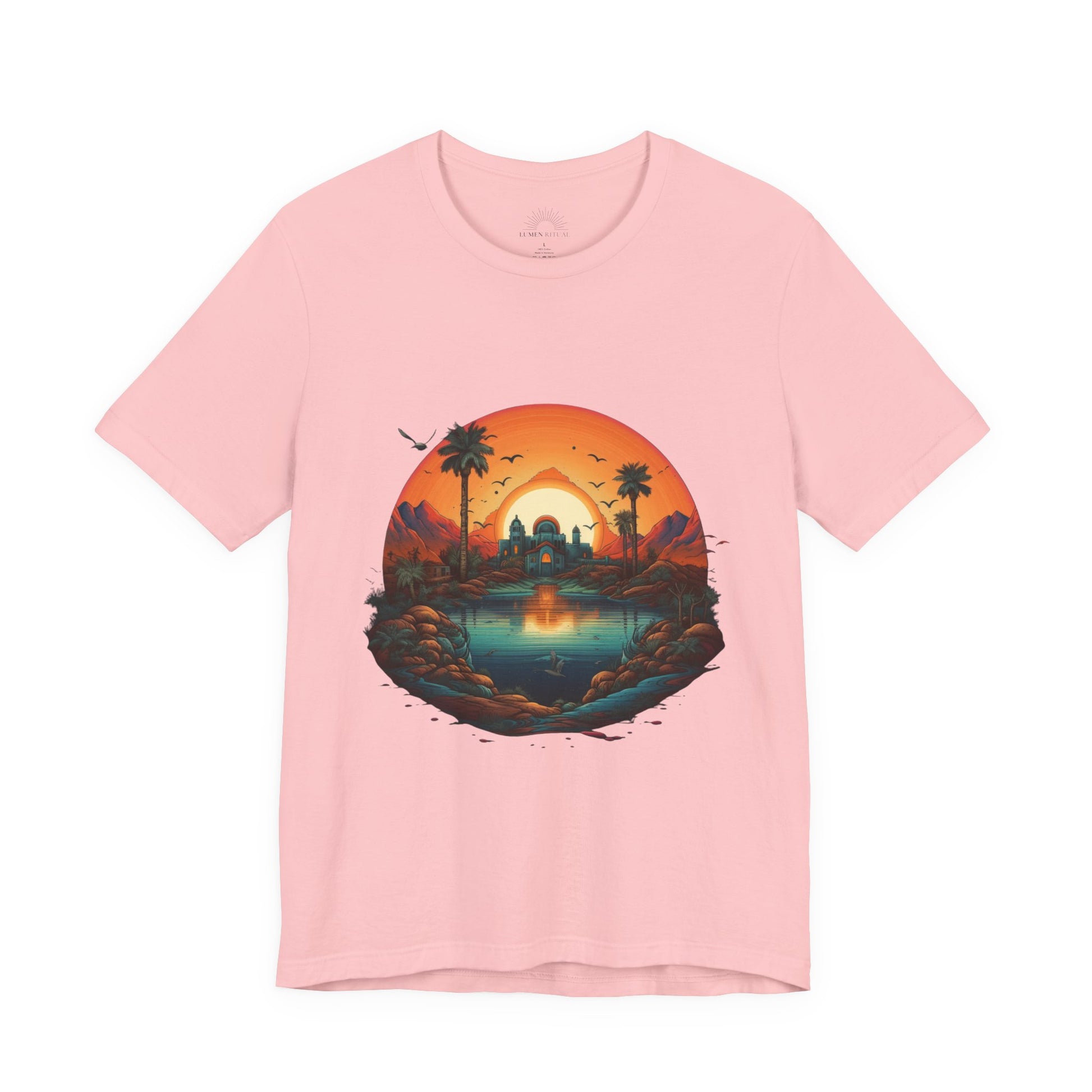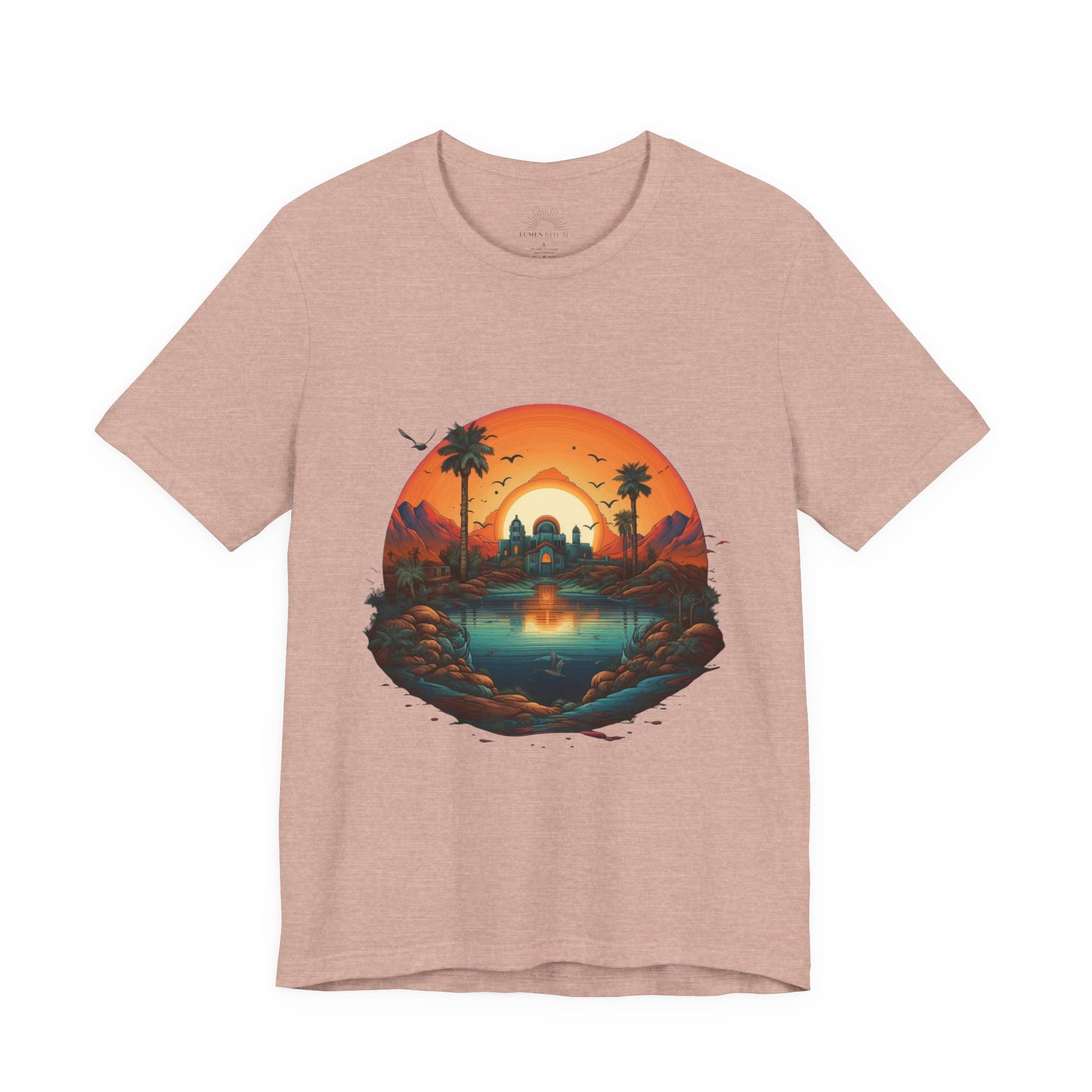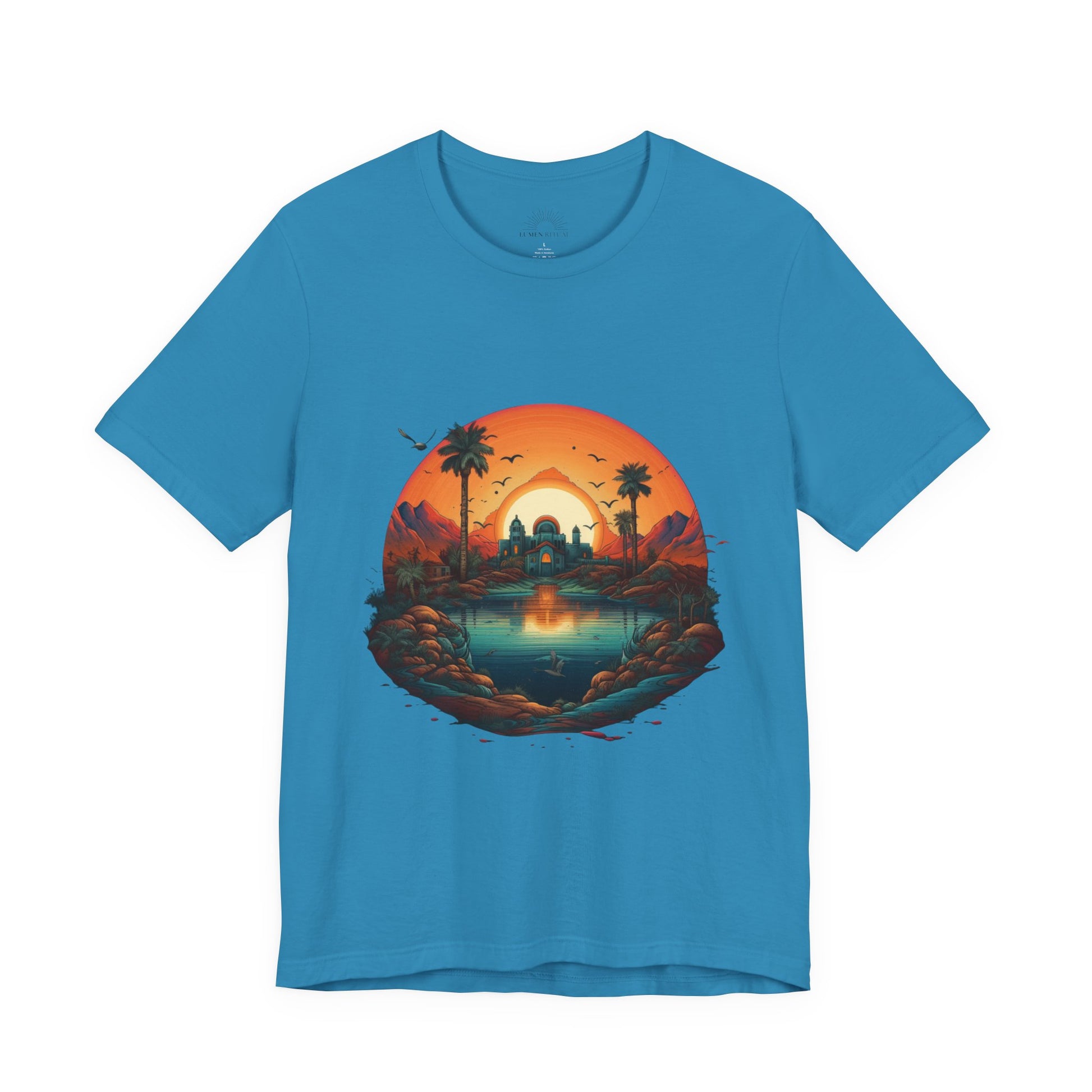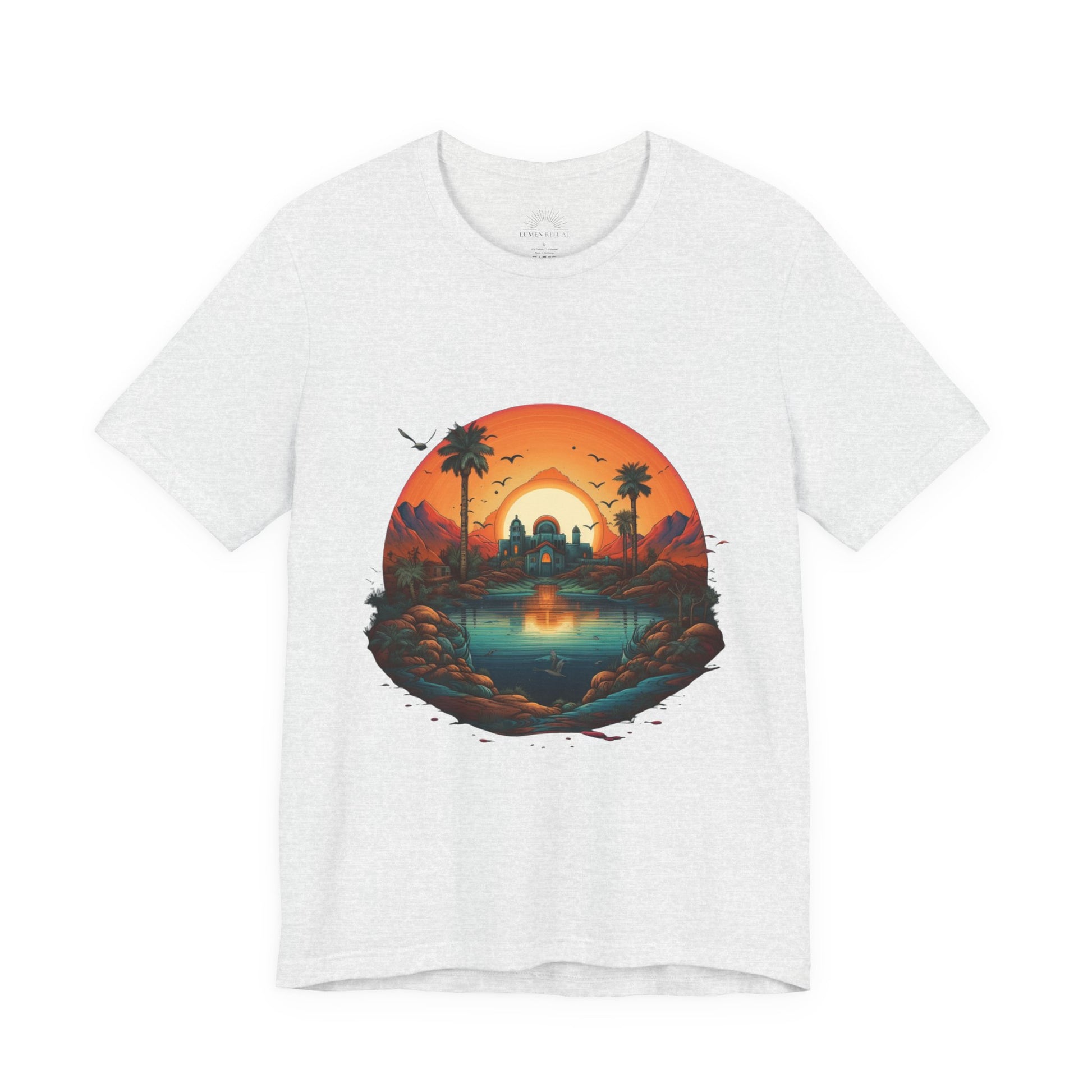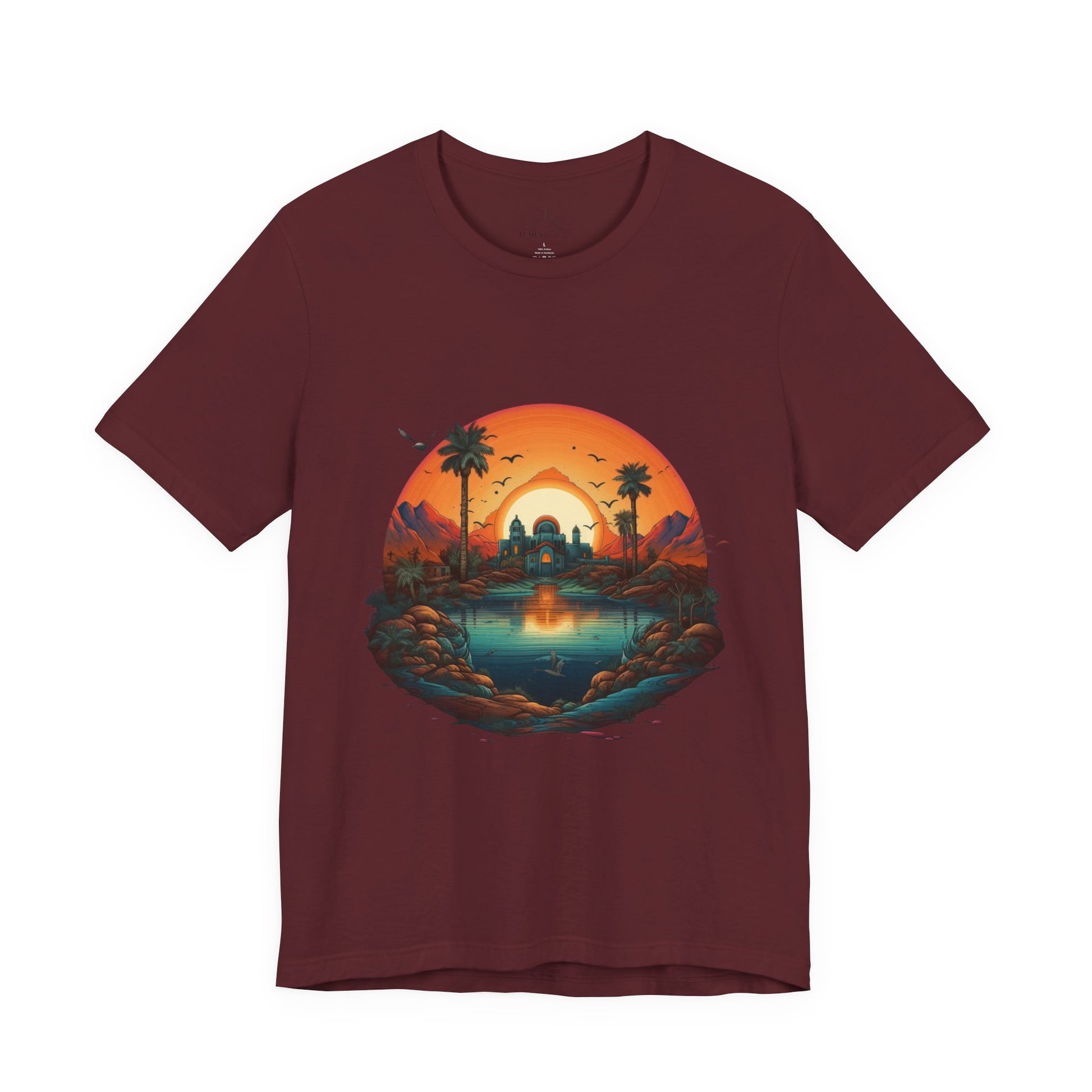 Sunset Oasis Unisex Tee - Summer Vibes, Graphic T-Shirt, Casualwear, Beachwear, Gift for Travelers, Nature Lover